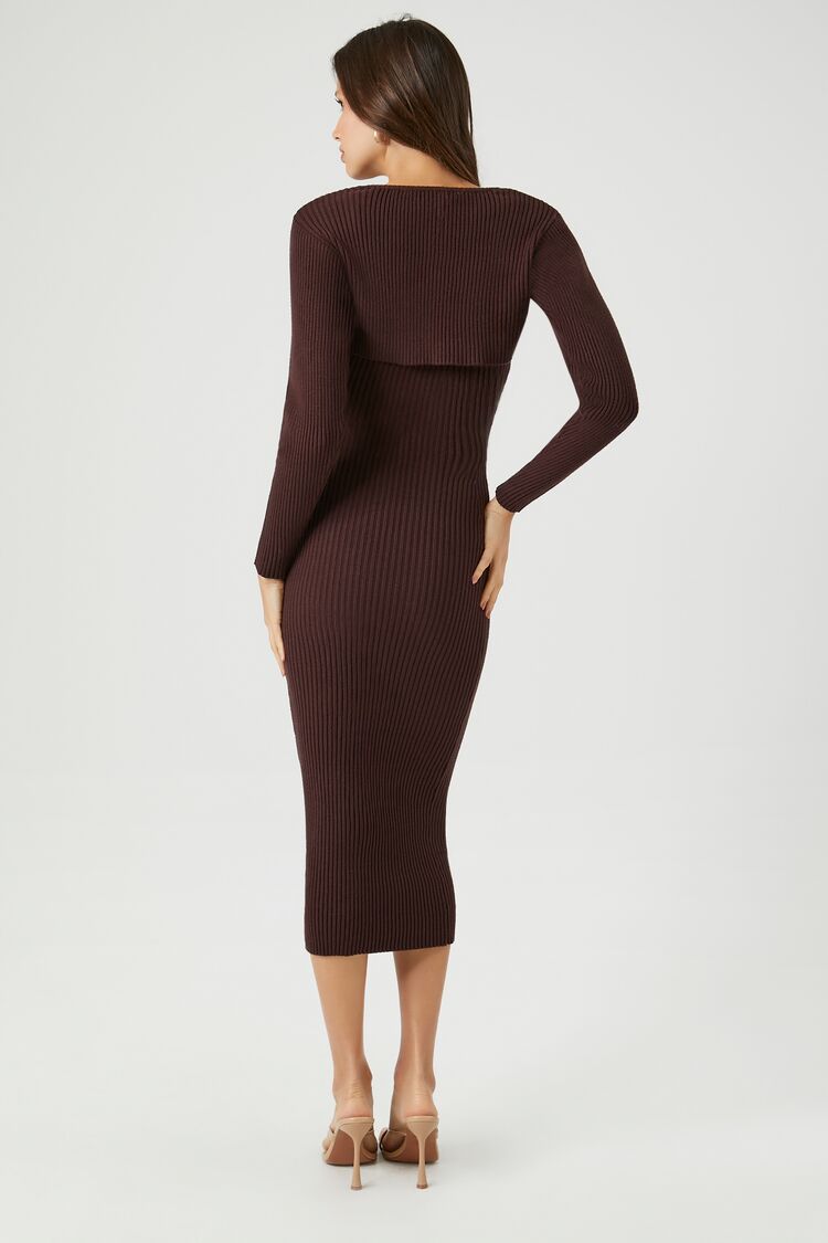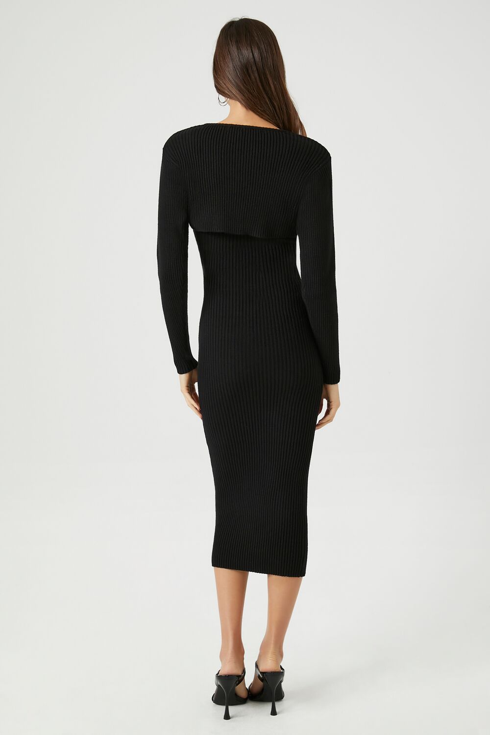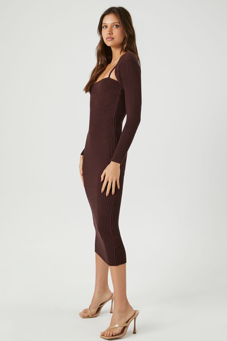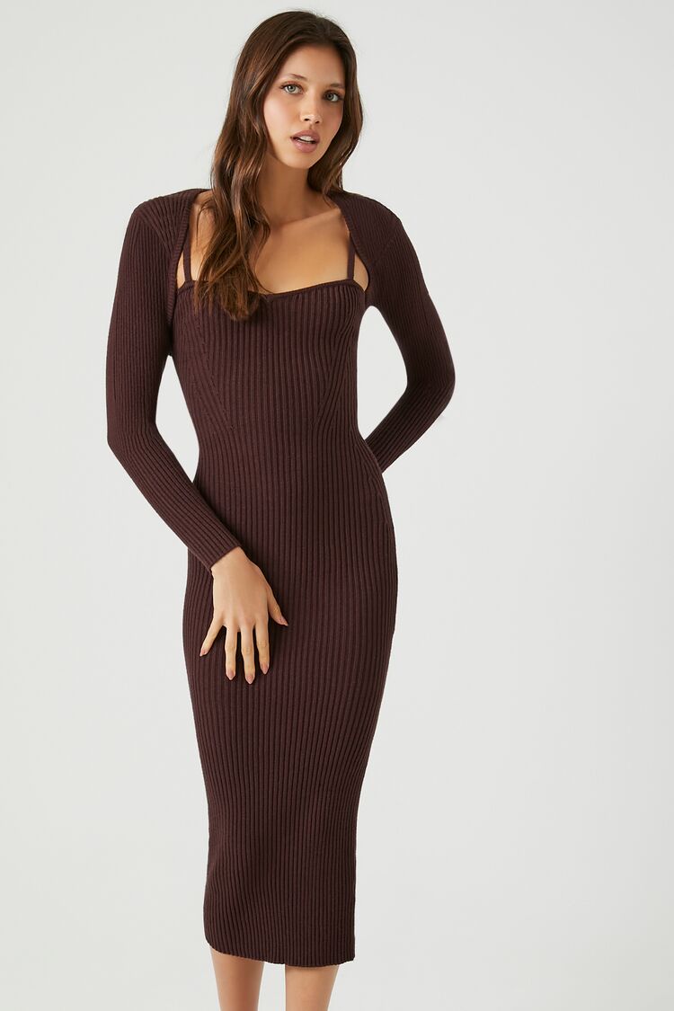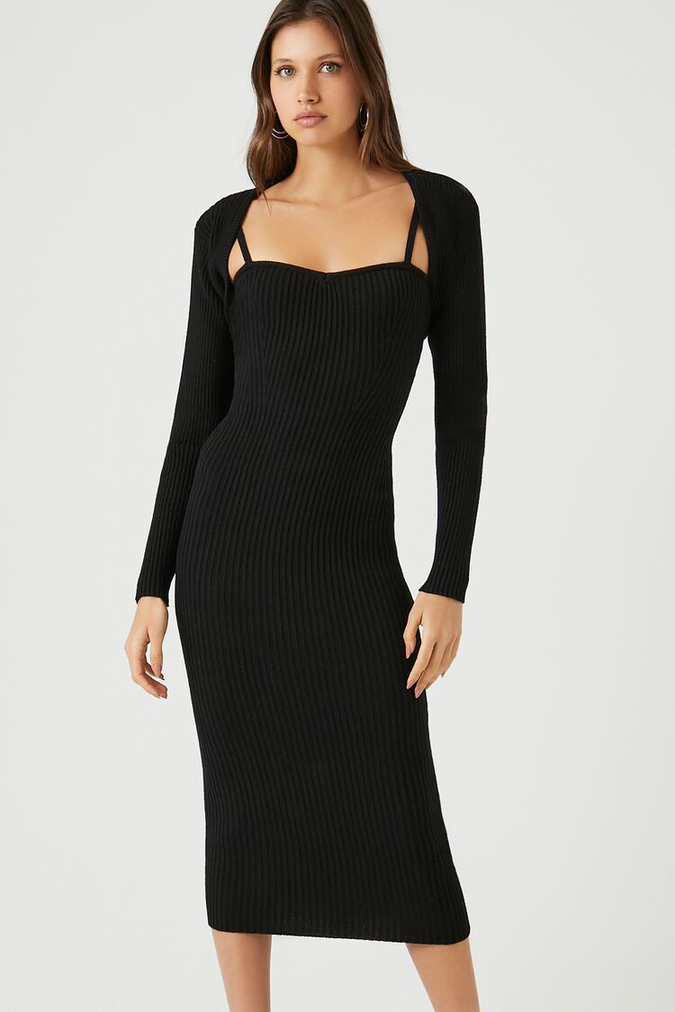 A sweater-knit set featuring a midi dress with a straight-cut neckline and back, cami straps, and bodycon silhouette, as well as a matching shrug sweater with long sleeves.