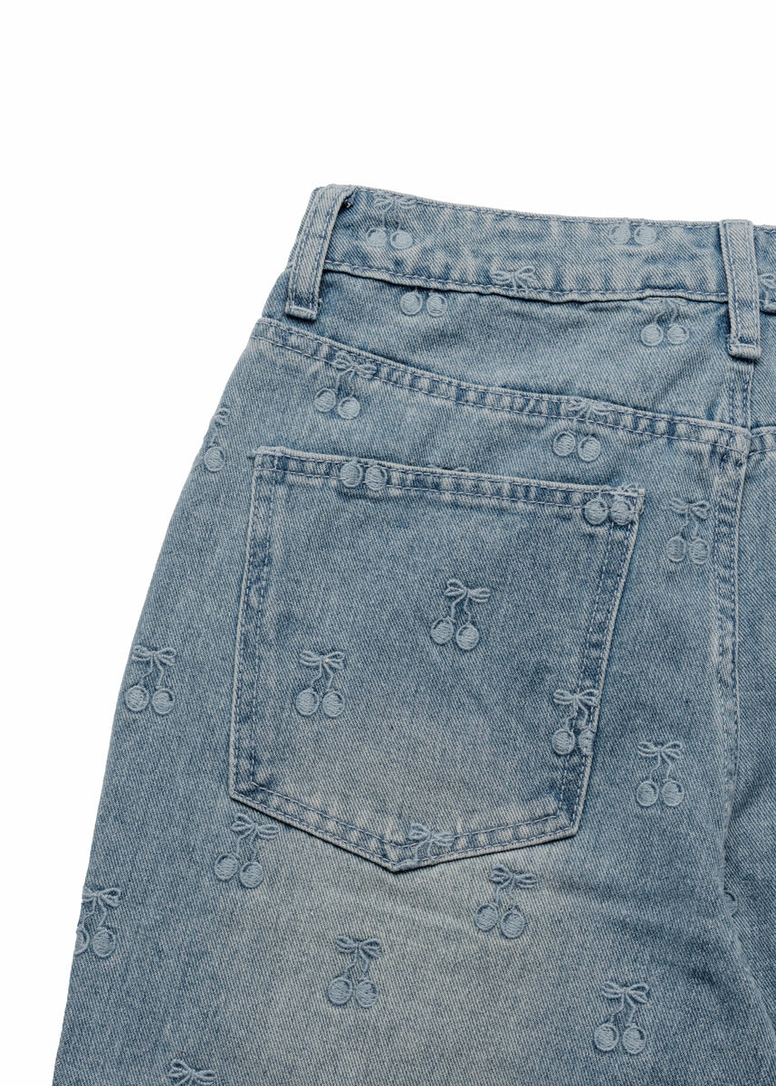 • Relaxed wide-leg denim with an allover cherry embroidery pattern