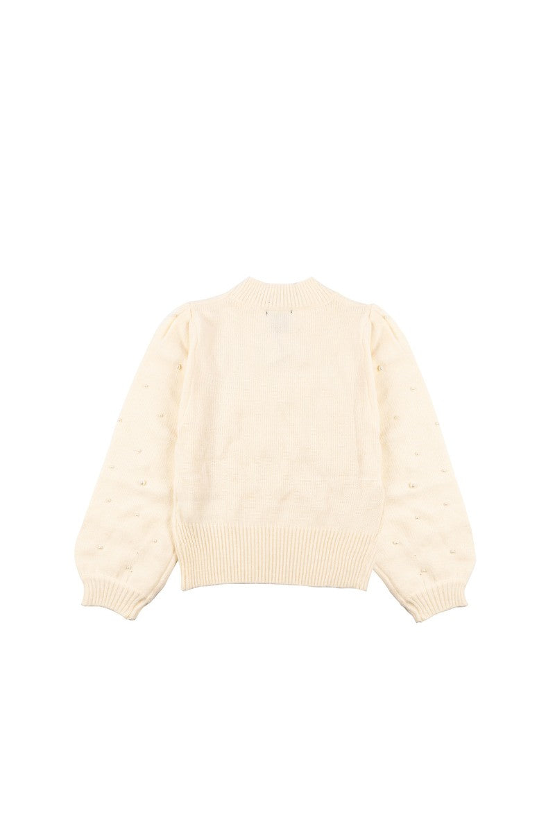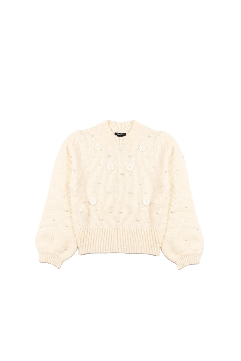 • Knit sweater adorned with floral appliqués and pearl-style accents